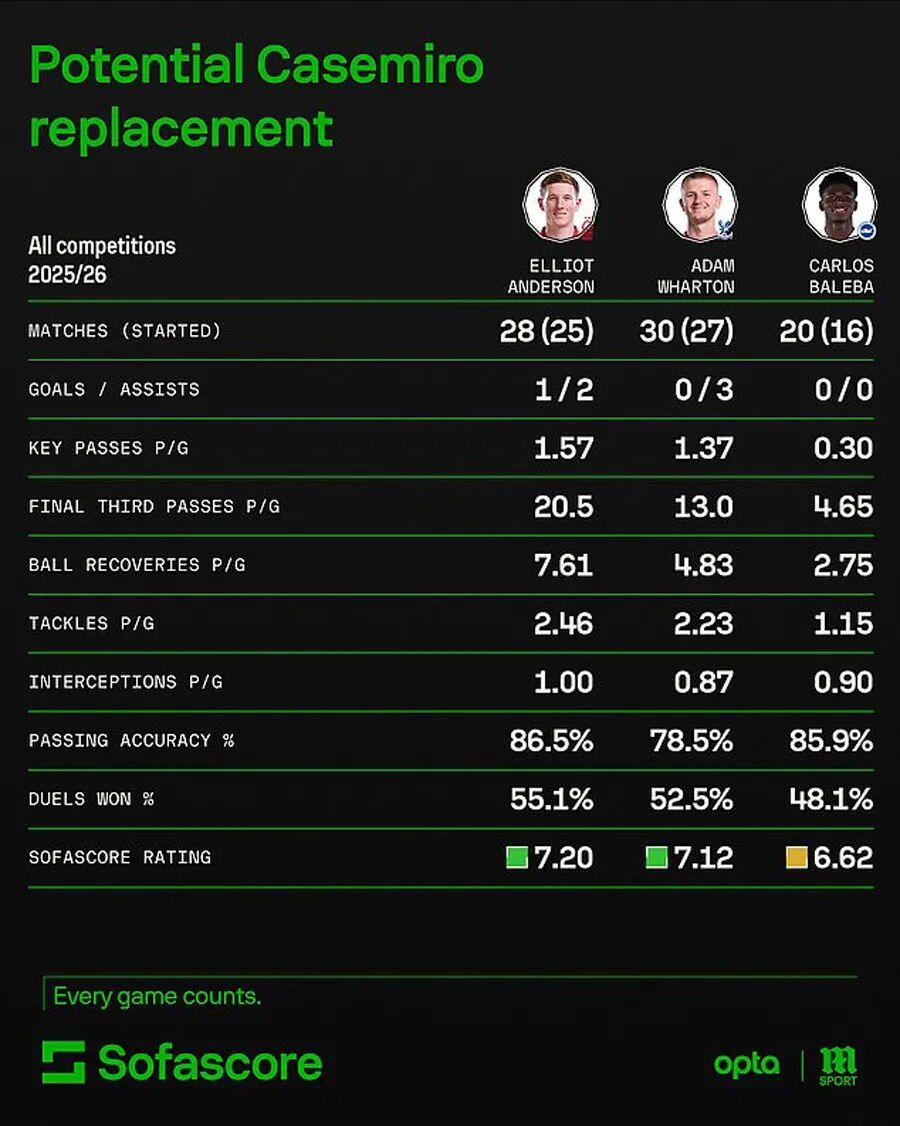 英国《太阳报》称,曼联准备引进以替代卡塞米罗的主要目标球员共有四人:包括英格兰国脚埃利奥特·安德森、亚当·沃顿和阿历克斯·斯科特,以及喀麦隆铁腰卡洛斯·巴莱巴,都是红魔拥趸听了一年的熟悉名字。